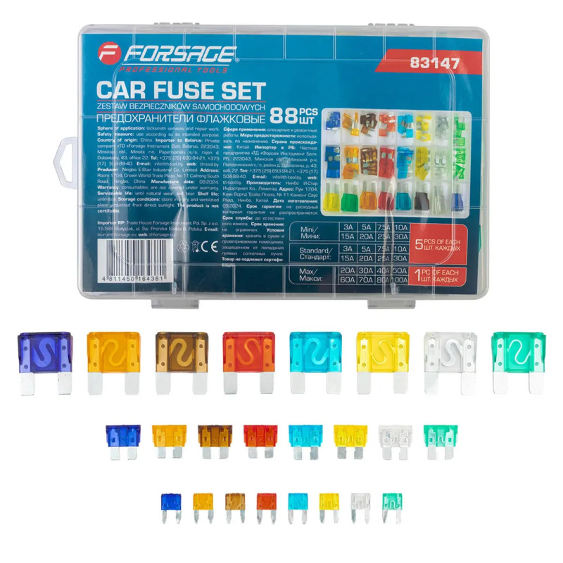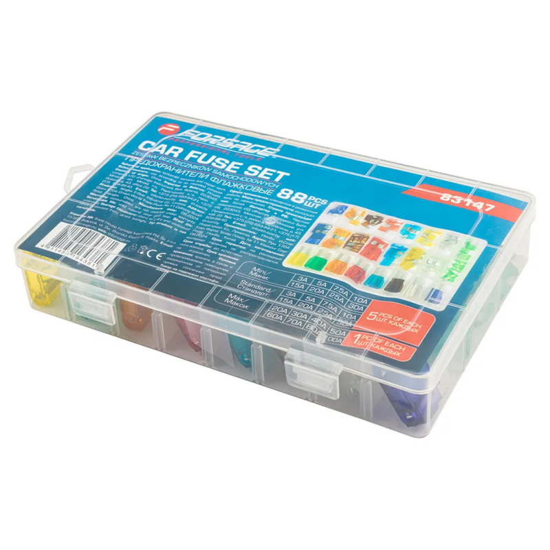 Предохранители плавкие флажковые автомобильные (от 3А до 100А), комплект 88пр. F-FS-100(83147)