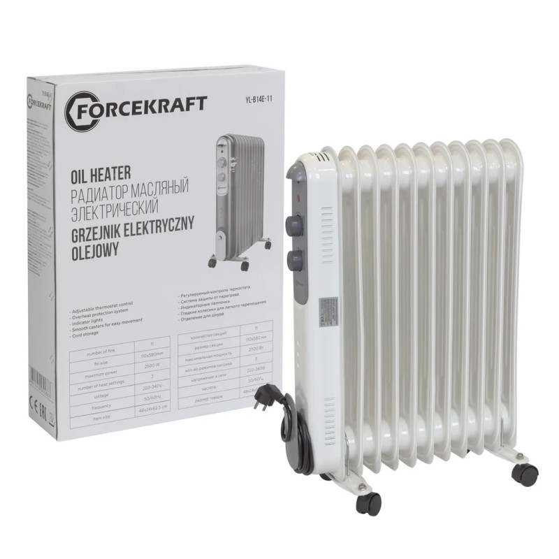 Масляный обогреватель на 11 секций — бытовой электроприбор, служащий для отопления помещений и имеющий промежуточный теплоноситель — минеральное масло. Температура внешней поверхности радиаторов, через которую они отдают тепло, не должна превышать 100—110 °C, средняя температура обычно 85-95 °C. Этот прибор выглядит как обычная батарея, которая работает от электрической сети. Внутри неё есть ТЭНы, они погружены в минеральное масло. Нагреваясь от электричества, ТЭНы разогревают масло, которое передаёт тепло корпусу. Быстрота нагрева комнаты зависит от количества секций в радиаторе, а также его мощности.