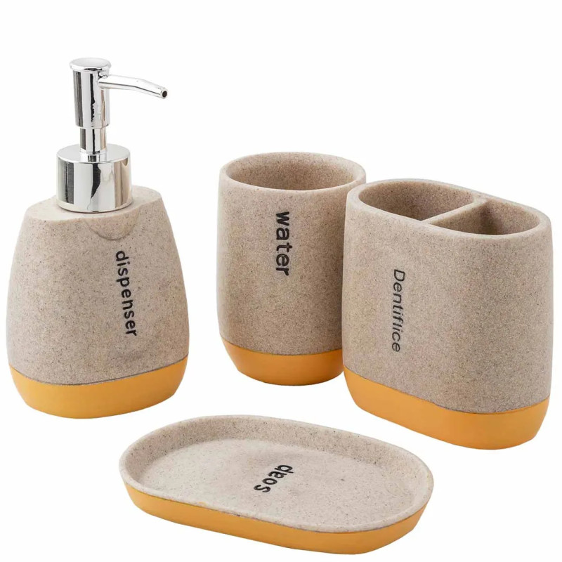 В комплекте для ванной комнаты представлен широкий выбор аксессуаров и принадлежностей. Предметы из высококачественного ударопрочного пластика станут стильным украшением интерьера вашей ванны и кухни, добавят нотку чистоты и свежести. Каждый элемент этого комплекта выполнен в универсальном бежевом цвете, который легко впишется в любой дизайн ванной комнаты, от классического до современного. Набор в ванную включает дозатор для жидкого мыла, стаканчики для косметических аксессуаров и зубных щеток и мыльницу. Стильная мыльница (длина 130мм, ширина 85мм) и дозатор для мыла (высота 155мм, длина 80мм, ширина 65мм, объем 200мл) подойдут как для ванной, так и для кухни. Мягкий дизайн набора для ванны мыльница и стакан делает его универсальным решением для любого интерьера. Пластиковый стаканчик для косметических аксессуаров (высота 100мм, диаметр 80мм, обьем 200мл) и зубных щеток (высота 95мм, длина 105мм, ширина 60мм) отлично дополнят комплект, обеспечивая удобное хранение мелочей и личную гигиену. Набор для мыла и