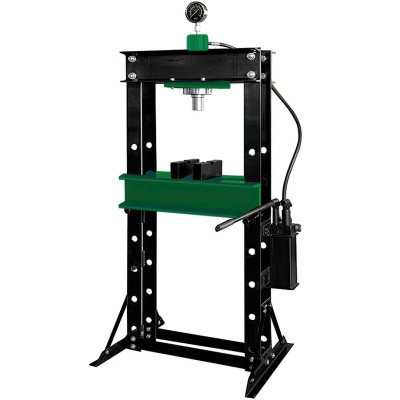Напольный гидравлический пресс приводится в действие при помощи рукояти. Устойчивое положение модели обеспечивается благодаря поперечным пластинам основания. Отверстия стоек позволяют с легкостью менять высоту стола. Пресс также оснащён манометром, служащим для контролирования давления.