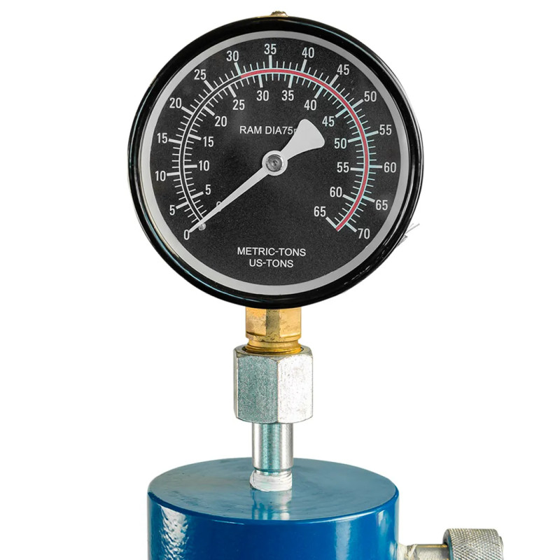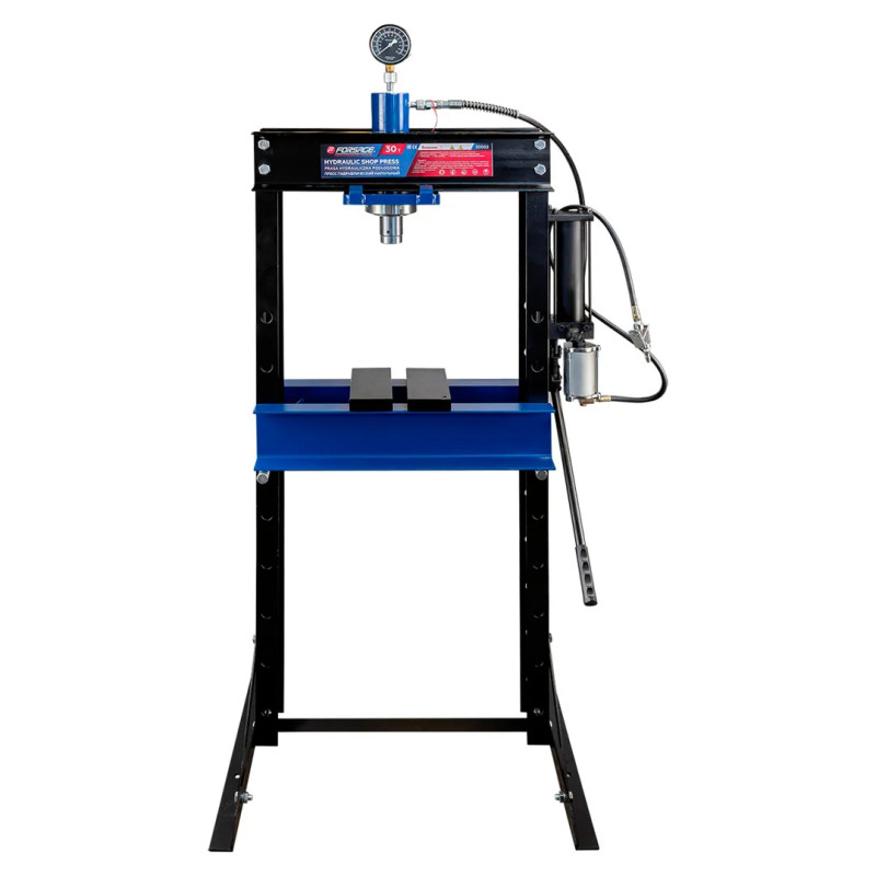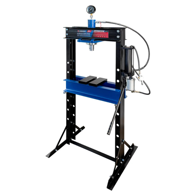 Пресс гидравлический напольный — это мощное и надежное профессиональное оборудование грузоподъемностью 30 тонн, предназначенное для выполнения различных видов работ, включая запрессовку и выпрессовку подшипников, шкивов, сайлент-блоков, а также операции сжатия, выгибания и прессования. Этот пресс идеально подходит для использования в автомастерских, промышленных предприятиях и других местах, где требуется мощное оборудование для работы с тяжелыми деталями и материалами. Напольный гидравлический пресс приводится в действие при помощи рукояти либо пневматически - насос пресса может подключаться к внешнему компрессору. Устойчивое положение модели обеспечивается благодаря прочной стальной раме и поперечным элементам основания. Отверстия стоек позволяют с легкостью менять высоту стола, обеспечивая рабочий диапазон высоты от 20 мм до 980 мм при ширине между стойками 585 мм, что позволяет работать с деталями различных габаритов. Ход штока составляет 162 мм, обеспечивая достаточную амплитуду движения для выполнения б