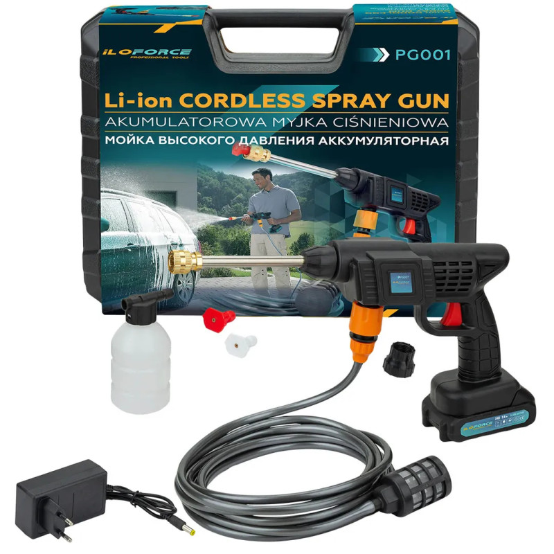 Мойка высокого давления аккумуляторная - это универсальный помощник для гаража, дома, дачи. Комплектация данной модели состоит из 3 видов насадок, что позволит легко справиться с любым видом загрязнения. Идеально подойдет для мойки автомобиля, мотоцикла или велосипеда. Кроме того, пистолет аккумуляторный можно использовать не только для мытья, но и для полива садовых растений. Для этого следует установить на копьё рассеивающую насадку, которая обеспечит распыление воды широким факелом как из душа, и отрегулировать напор. Для мойки авто и твердых поверхностей подойдет спринклер высокого давления. А пеногенератор поможет быстро нанести моющее средство на любой сильно загрязнённый предмет или поверхность. Ее щеточный двигатель обеспечивает эффективную и мощную подачу воды под давлением, решая задачи чистки с минимальным усилием. Корпус мойки высокого давления выполнен из прочного пластикового материала, который обеспечивает стойкость к механическим воздействиям и защиту от возможного удара. Весь набор поставляет