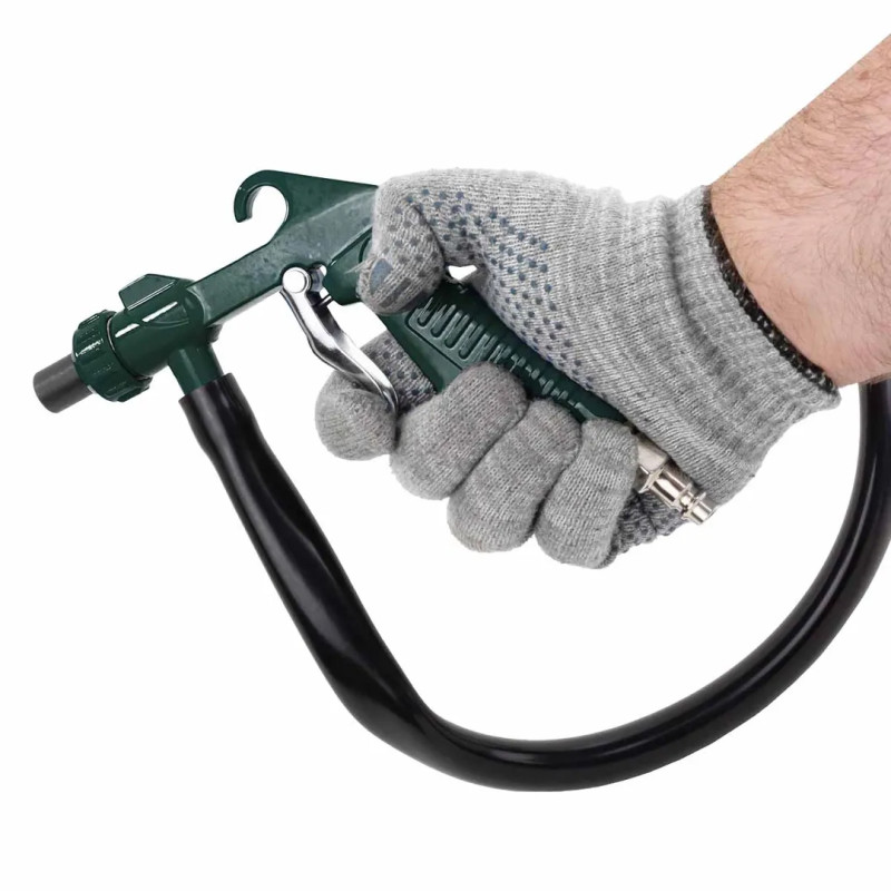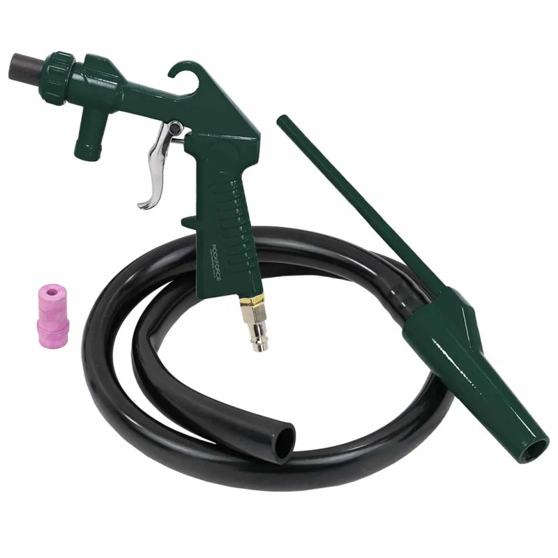 Пистолет пескоструйный предназначен для слесарных работ, таких как обработка металлических поверхностей изделий от коррозии, лака, краски и других покрытий. Обработка металлических поверхностей потоком частиц песка в струе сжатого воздуха позволяет эффективно удалять с них ржавчину, окалину, лаковые покрытия, застарелую краску и отвердевшую масляно-пылевую пленку. Важнейшим элементом инжекторной технологии струйной очистки изделий и деталей является пескоструйный пистолет со сменными соплами. В отличие от моделей с собственным бачком для абразива, которые пригодны только для локальной обработки конструкций, предлагаемое изделие относится к пистолетам пескоструйным шлангового типа. Данное устройство имеет 2 входа для присоединения шлангов подачи сжатого воздуха и абразива и держатель керамического или металлическое сопла. Учитывая, что изменение формы и диаметра выходного отверстия струйного инжектора позволяет вести обработку объектов в различных режимах, пистолет пескоструйный (2 сменных сопла) имеет преимущ
