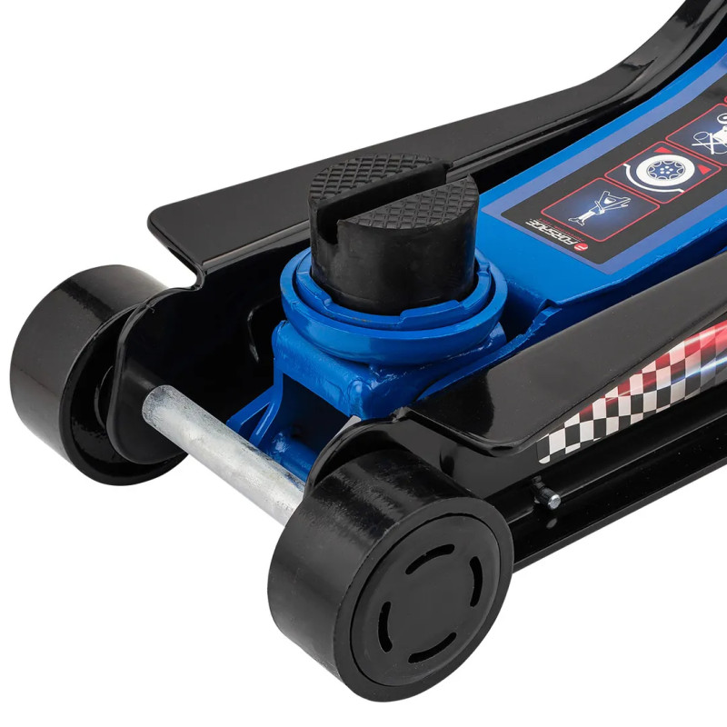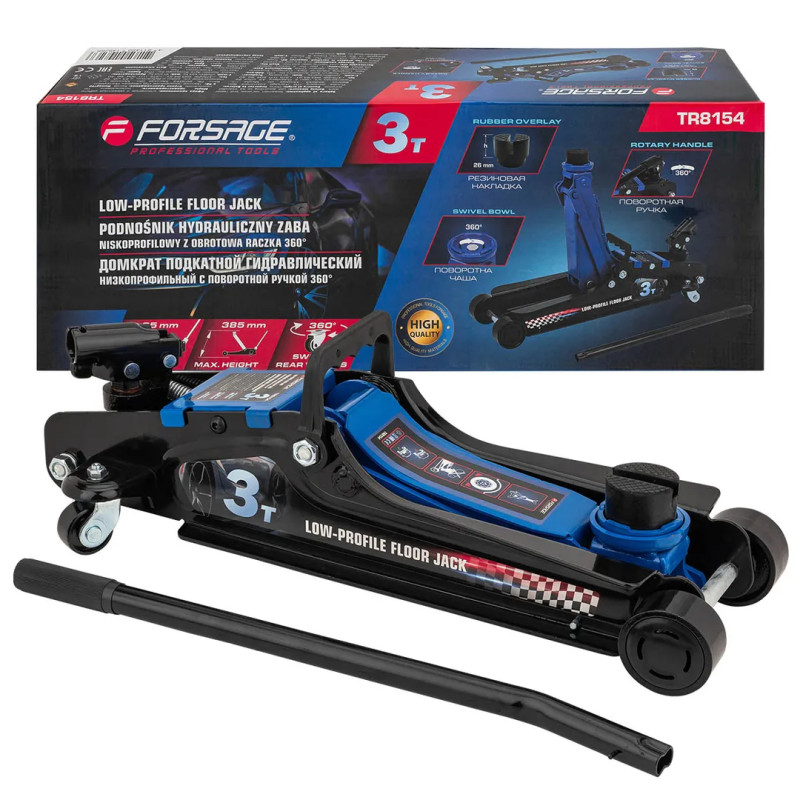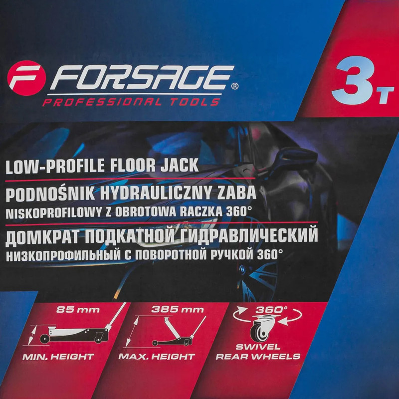 Домкрат подкатной гидравлический идеально подходит для ежедневного использования в автомастерской, на шиномонтаже или в гараже. Прочный гидравлический блок с поршневым насосом обеспечивает быстрый подъем автомобиля без особых усилий. Подъем и опускание можно легко регулировать. Мобильность и надежность: домкрат оснащен 2 фиксированными и 2 поворотными колесами, поэтому его можно легко перемещать. Благодаря предохранительному клапану домкрат соответствует стандарту безопасности. Особенность конструкции - низкий профиль: подходит для использования с низким клиренсом (спорткары и некоторые седаны); поворотная ручка обечспечивает удобство при работе в ограниченных пространствах. В комплекте прочная резиновая накладка, которая предотвращает от повреждения автомобиля: исключает возможность повредить кузов, предохраняет от самопроизвольного соскальзывания. Максимальная нагрузка: 3000 кг. Высота подхвата 85 мм. Высота подъёма 385 мм.