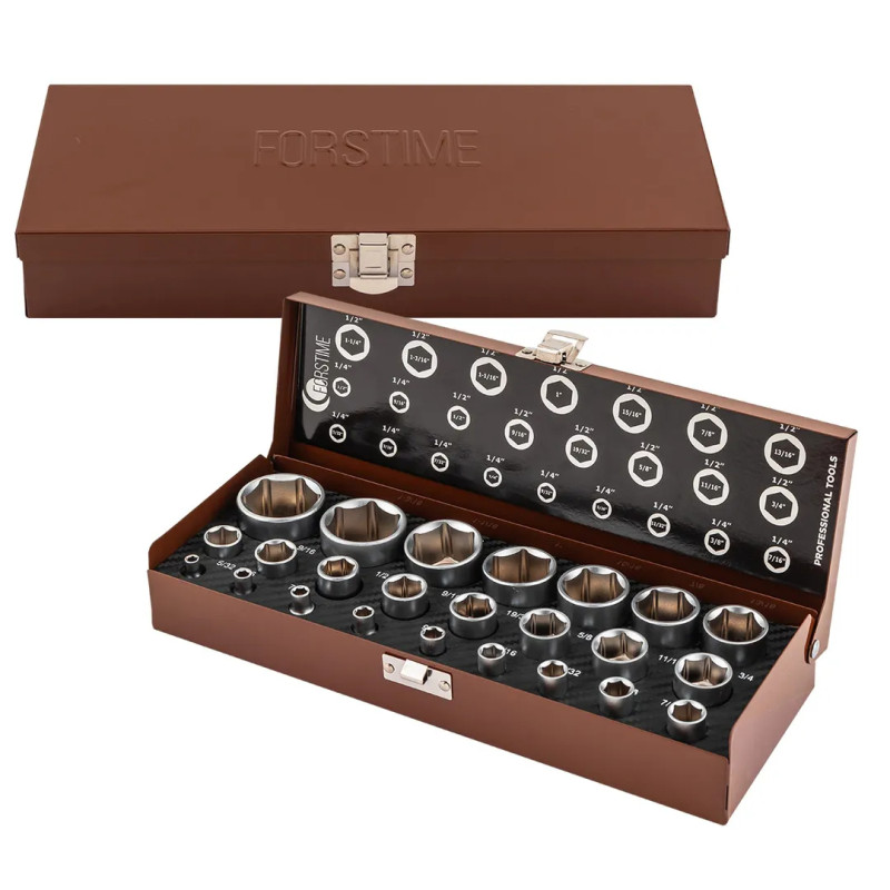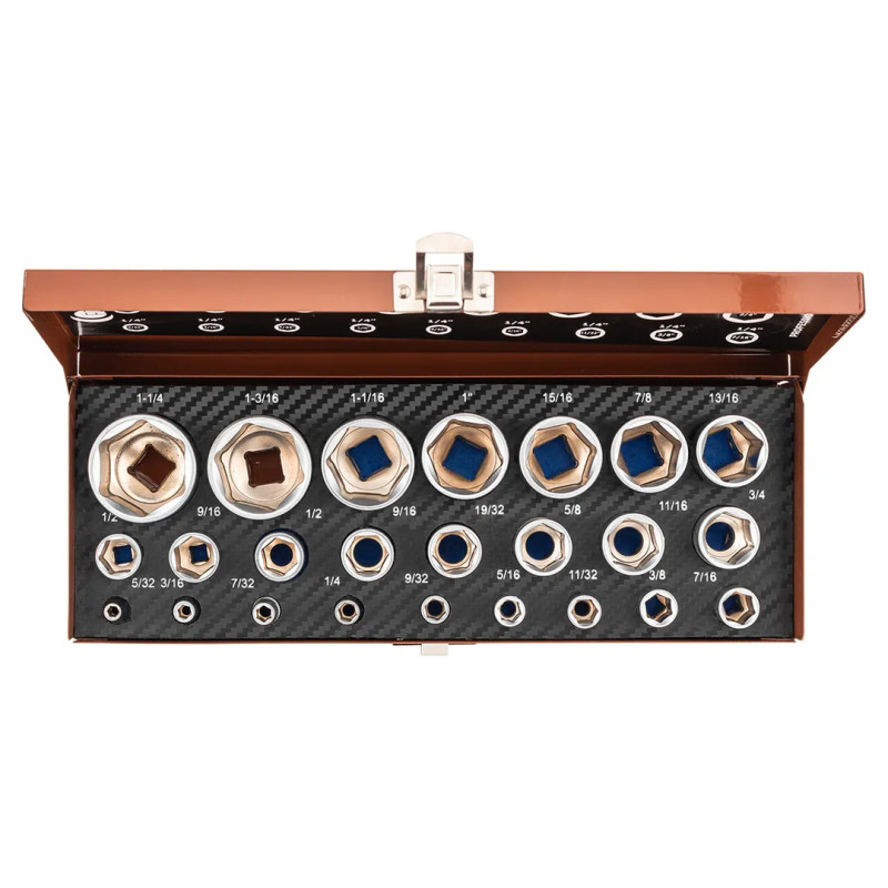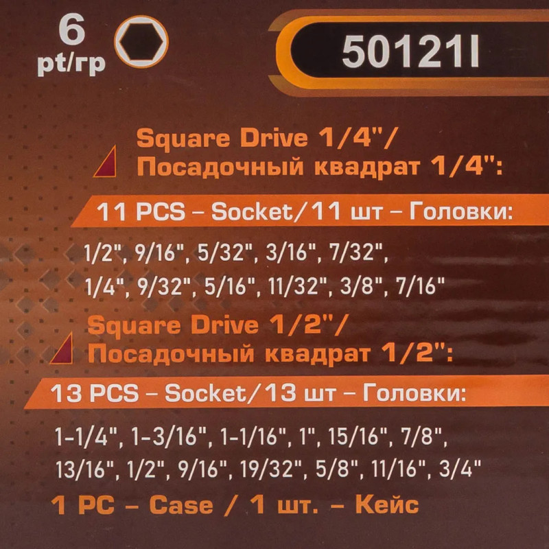 Набор 25пр. дюймовых головок — это профессиональный комплект из 25 предметов, включающий головки с размерами от 5/32" до 1-1/4" для работы с крепежными элементами различных типов. Набор включает головки с двумя размерами присоединительного квадрата: 1/4" и 1/2", что позволяет использовать их с различными типами воротков и трещоток. Конкретный размерный ряд включает, под квадрат 1/4": 5/32", 3/16", 7/32", 1/4", 9/32", 5/16", 11/32", 3/8", 7/16", 1/2", 9/16"; под квадрат 1/2": 1/2", 9/16", 19/32", 5/8", 11/16", 3/4", 13/16", 7/8", 15/16", 1", 1-1/16", 1-3/16", 1-1/4". Головки изготовлены из хромованадиевой стали марки CH-V, что обеспечивает высокую прочность, износостойкость и коррозионную устойчивость. Для удобства транспортировки и хранения комплект расположен а ложементе в металлическом кейсе. Комплект предназначен для выполнения слесарных и ремонтных работ в условиях автосервиса, производственных мастерских и бытового использования. Все изделия имеют точную калибровку и оптимальный профиль для надежного за