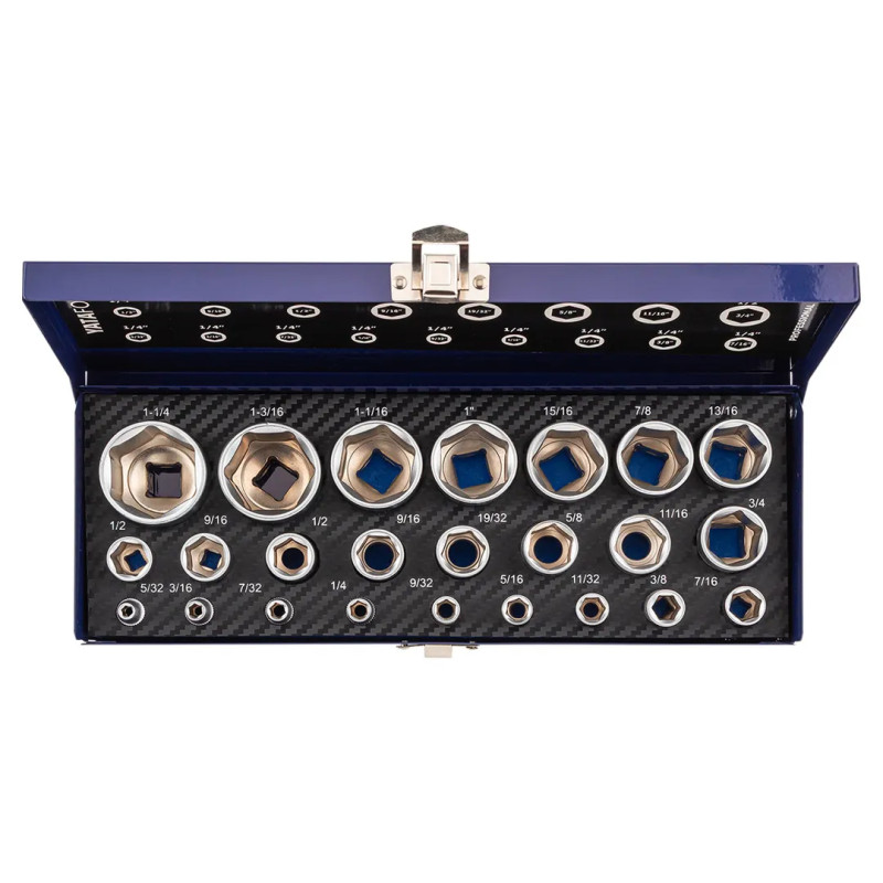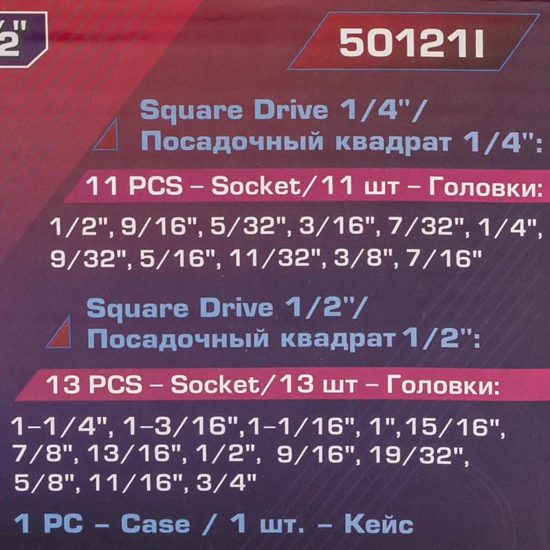 Набор 25пр. дюймовых головок — это профессиональный комплект из 25 предметов, включающий головки с размерами от 5/32" до 1-1/4" для работы с крепежными элементами различных типов. Набор включает головки с двумя размерами присоединительного квадрата: 1/4" и 1/2", что позволяет использовать их с различными типами воротков и трещоток. Конкретный размерный ряд включает, под квадрат 1/4": 5/32", 3/16", 7/32", 1/4", 9/32", 5/16", 11/32", 3/8", 7/16", 1/2", 9/16"; под квадрат 1/2": 1/2", 9/16", 19/32", 5/8", 11/16", 3/4", 13/16", 7/8", 15/16", 1", 1-1/16", 1-3/16", 1-1/4". Головки изготовлены из хромованадиевой стали марки CH-V, что обеспечивает высокую прочность, износостойкость и коррозионную устойчивость. Для удобства транспортировки и хранения комплект расположен а ложементе в металлическом кейсе. Комплект предназначен для выполнения слесарных и ремонтных работ в условиях автосервиса, производственных мастерских и бытового использования. Все изделия имеют точную калибровку и оптимальный профиль для надежного за