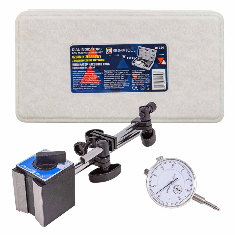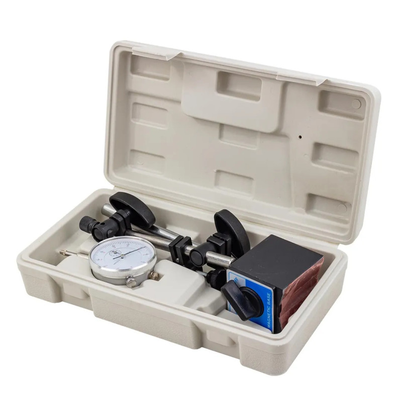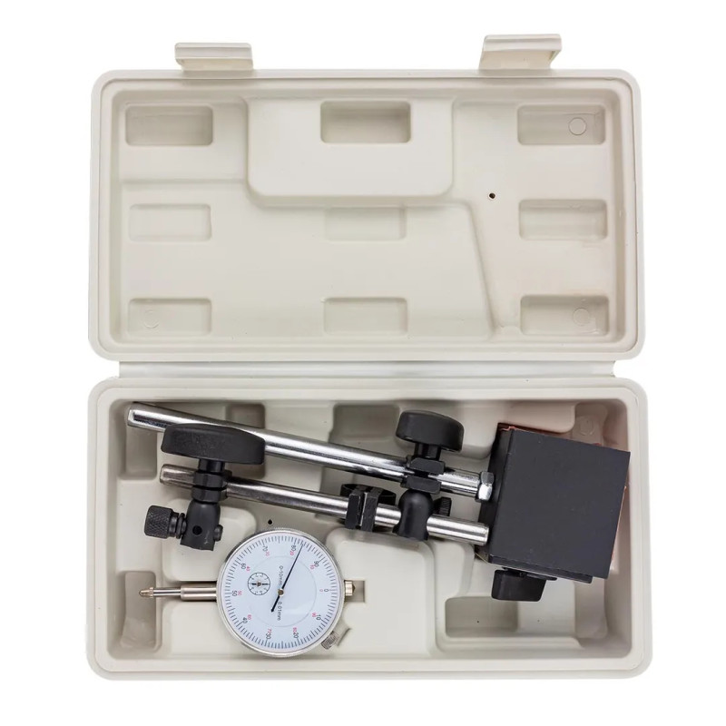 Индикатор часового типа – устройство для измерений и контроля отклонений от эталонной детали. Индикаторы без стойки не используют, так как опора придает дополнительную жесткость. Вам не надо покупать отдельно стойку, так как она идет в комплекте с индикатором. Стойку с магнитным основанием можно закреплять на горизонтальных, вертикальных или наклонных поверхностях для позиционирования измерительного устройства. Принцип действия действия часовых индикаторов основан на преобразовании линейного перемещения наконечника в соответственное перемещение стрелок циферблата. Индикатор широко применяется там, где необходим контроль горизонтальности и/или вертикальности положения плоскостей деталей, отклонения от плоскостности, параллельности, биения и т.д., служит для проверки качества в рамках стандартов и допусков на различных предприятиях – от автомобилестроения до частных мастерских.
