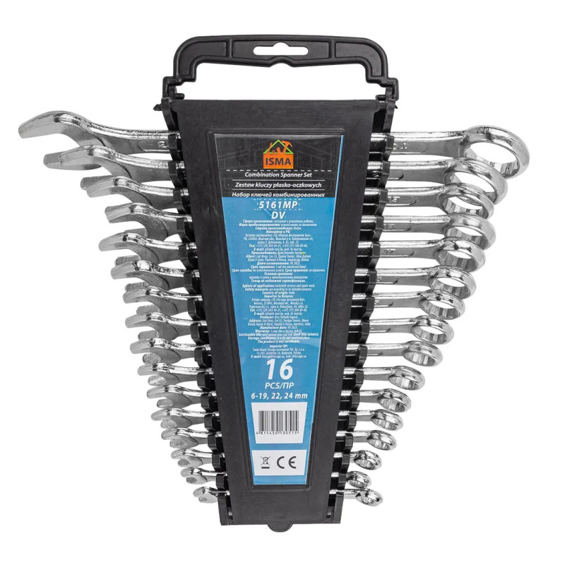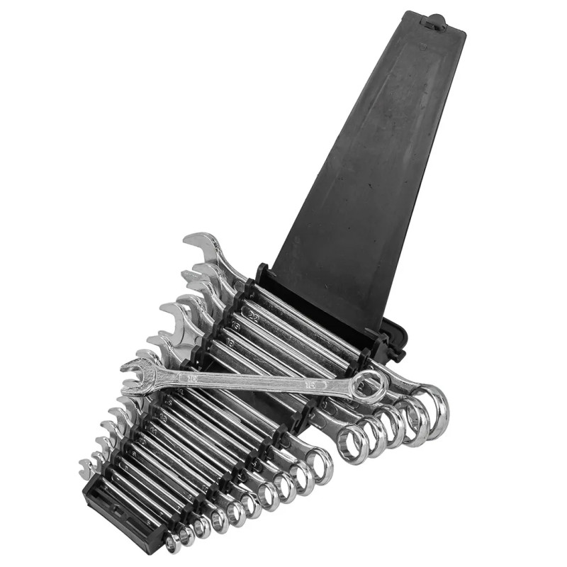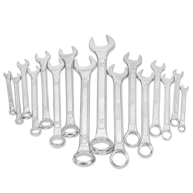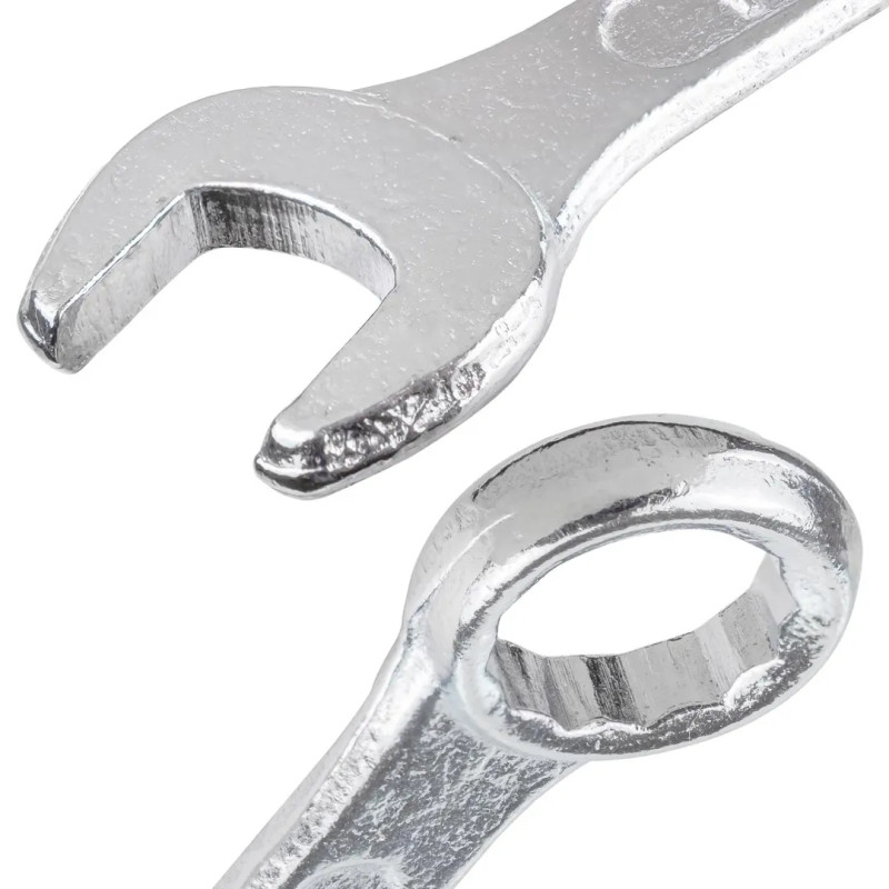 Ключи гаечные комбинированные ключи – универсальные гаечные ключи, совмещающие в себе функционал и преимущества рожковых и накидных ключей. Зевы комбинированных ключей имеют одинаковые размеры. Ключи гаечные с открытым и кольцевым зевами предназначены для монтажа либо демонтажа резьбовых соединений. Набор изготовлен из высококачественной стали Cr-V.
