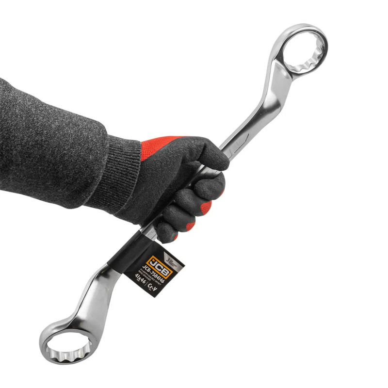 Ключ накидной отогнутый на 45грд. 41х46 мм. Двусторонний накидной ключ со смещением, имеет на обоих концах 12-гранные накидные профили отогнутые на 45 градусов. Накидной профиль со смещением предоставляет более широкие возможности при работе в ограниченном пространстве. Применяются в качестве основного ручного инструмента при проведении работ с высоконагруженными резьбовыми соединениями. Изогнутая рабочая часть облегчает применение ключей в труднодоступных местах. Изготовлен из высококачественной хромованадиевой (Crv) стали методом холодного штампа.