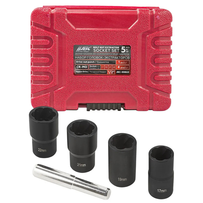 Набор слесарного инструмента для удаления болтов, винтов и саморезов со сломанными головками или разбитыми шлицами. Применяется для извлечения поврежденных болтов, шпилек и иных резьбовых крепежных изделий. Посадочный квадрат 1/2". Комплектация: головки-экстракторы, выколотка Размеры: головки 17, 19, 21, 22 мм; выколотка длинна 80 мм, диаметр 12 мм. В пластиковом кейсе.