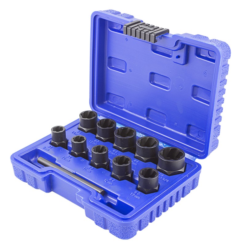 Набор слесарного инструмента для удаления болтов, винтов и саморезов со сломанными головками или разбитыми шлицами. Применяется для извлечения поврежденных болтов, шпилек и иных резьбовых крепежных изделий. Посадочный квадрат 3/8". Комплектация: головки-экстракторы, выколотка Размеры: головки 9мм (шестигранная часть под ключ 16мм), 10мм (шестигранная часть под ключ 16мм), 11мм (шестигранная частть под ключ 17мм), 12мм (шестигранная часть под ключ 19мм), 13мм (шестигранная часть под ключ 19мм), 14мм (шестигранная часть под ключ 22мм), 15мм (шестигранная часть под ключ 22мм), 16мм-5/8"(шестигранная часть под ключ 24мм), 17мм (шестигранная часть под ключ 24мм), 19мм-3/4"(шестигранная часть под ключ 27мм); выколотка длинна 90 мм, диаметр 7 мм. В пластиковом кейсе.