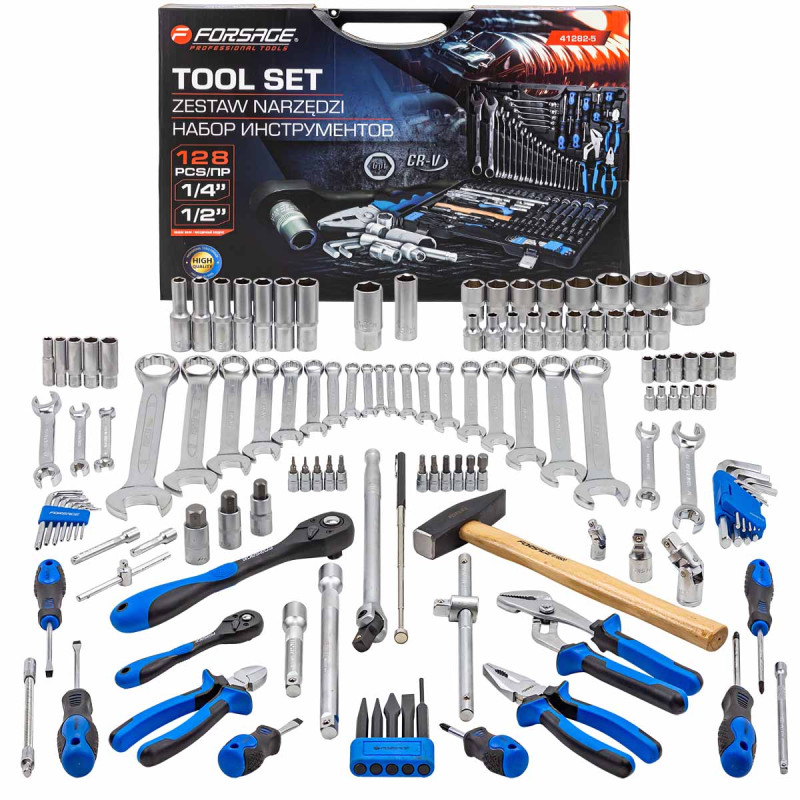 Набор инструментов состоит из 128 предметов в кейсе и включает в себя практически всё, что необходимо для большинства ремонтных работ - как в гараже обычного автолюбителя, так и в боксе специализированного сервиса. За счет высокого качества и прочности всех составляющих комплекта, для производства которого применяются особые марки высоколегированных сталей, данный набор инструментов сможет использовать в работе любой профессиональный мастер. Комплектация: головки 1/4"12 шт. (4, 4.5, 5, 5.5, 6, 7, 8, 9, 10, 11, 12, 13 мм.), головки глубокие 1/4"5 шт. (7, 8, 10, 12, 13 мм.), головки-биты Hex 1/4"6 шт. (H4, H5, H6, H7, H8, H10 мм.), головки Torx 1/4"5шт. (T10, Т15, Т20, Т25, Т27), головки 1/2"18 шт. (8, 9, 10, 11, 12, 13, 14, 15, 16, 17, 18, 19, 21, 22, 24, 27, 30, 32 мм.), головки глубокие 1/2"7 шт. (10, 12, 13, 14, 15, 17, 19 мм.), головки-биты Нех 1/2"3шт. (H12, H14, H17мм.), головки свечные 1/2"16 и 21 мм., удлинители 1/4"(L-50, 75 и 150 мм.), вороток Т-образный 1/4"130 мм., вороток Т-образный 1/2"250 мм., карданы 1/4"и 1/2", удлинители 1/2"(50, 125 и 250 мм.), удлинитель гибкий 1/4"145 мм., вороток 1/2"375 мм., трещотка 1/4"72 зуба, трещотка 1/2"72 зуба, ключи комбинированные 19 шт. (6, 7, 8, 9, 10, 11, 12, 13, 14, 15,16, 17, 19, 21, 22, 24, 27, 30, 32 мм.), ключи разрезные 5 шт. (8х10, 9х11, 12Х13, 14Х17, 17Х19 мм.), ключи шестигранные Г-образные 9 шт. (1.5, 2, 2.5, 3, 4, 5, 6, 8, 10 мм.), ключи шестигранные Torx 7 шт. (T10, Т15, T20, Т25,Т27, T30, T40), набор зубил и выколоток 5 шт., плоскогубцы переставные 10", кусачки 6", плоскогубцы комбинированные 7", магнит телескопический, молоток 500 г., отвертки 6 шт. (PH2x38, PH2х100, PH1x75, SL6.5X38, SL6X100, SL5Х75 мм.), кейс.