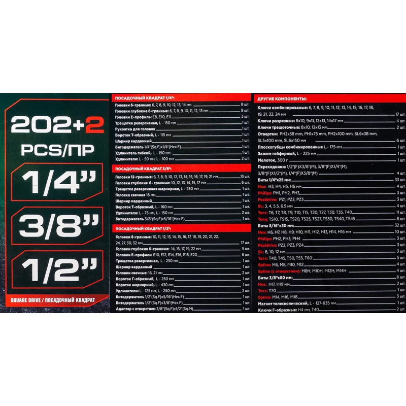 Набор инструментов 202+2пр. 1/4 , 3/8 , 1/2 (6гр.,12гр.) RF-42022+2