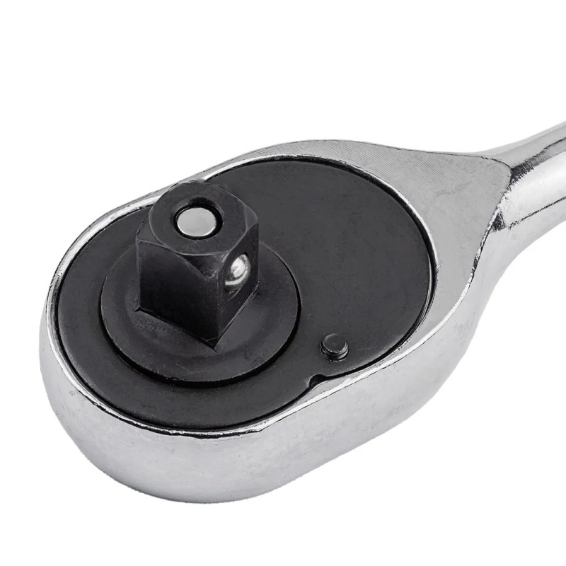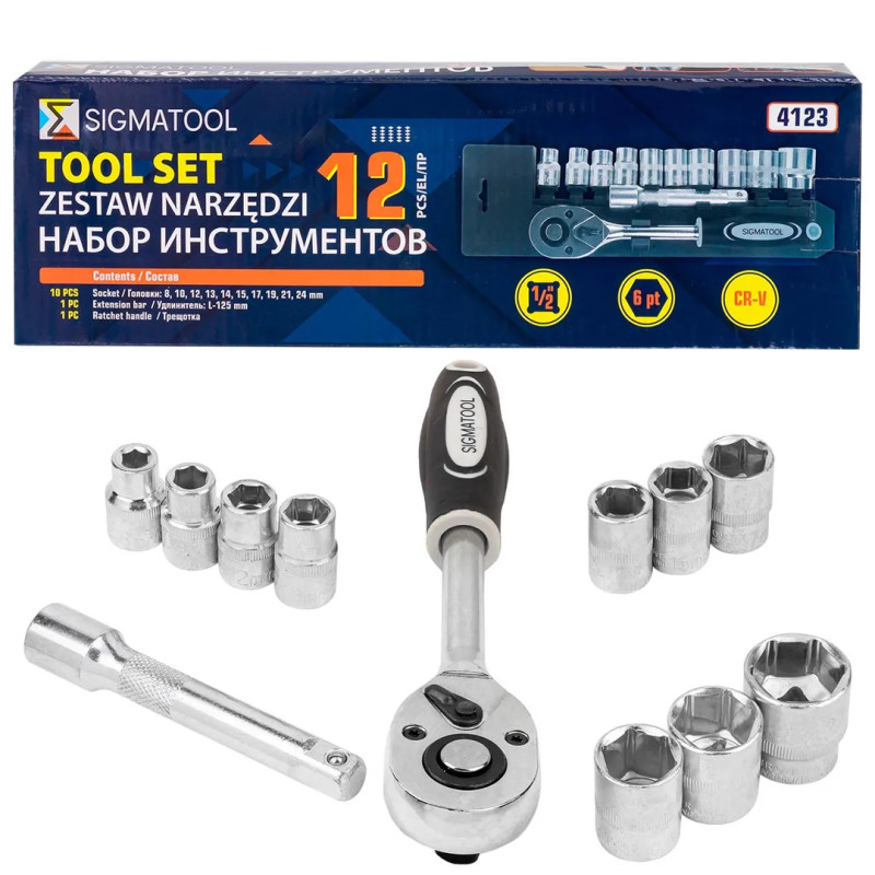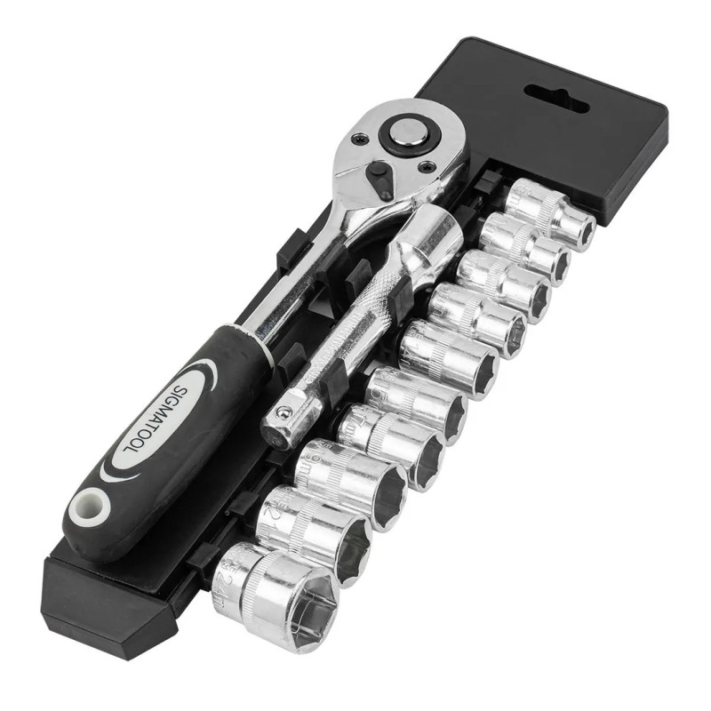 Данный набор инструментов на 12 предметов идеально подходит для использования в автомобильных и механических работах. Все инструменты изготовлены из высококачественной хромванадиевой стали, обладают прочностью и долговечностью, что гарантирует их долгий срок службы.Трещотка снабжена эргономичной прорезиненной рукояткой, что делает работу комфортной и удобной даже при продолжительном использовании. Комплектация: головки (8, 10, 12, 13, 14, 15, 17, 19, 21, 24 мм), трещотка 255мм 24зуб., удлинитель 125мм, пластиковый держатель.