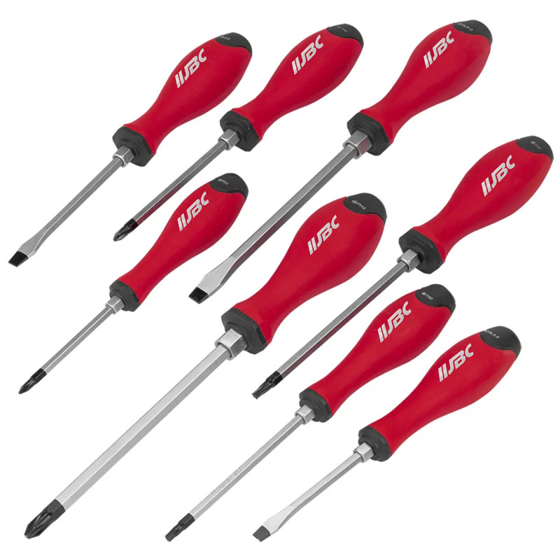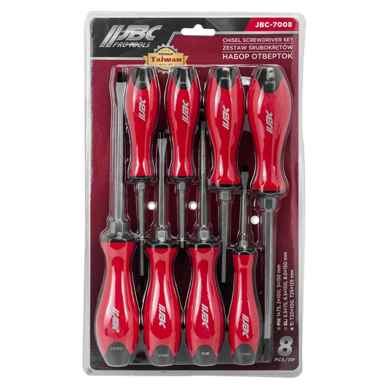 Набор отверток силовых с магнитными наконечниками 8 предметов в блистере - это удобный и надежный инструмент для работы с крепежными элементами. Отвертки имеют магнитные наконечники, которые позволяют легко захватывать и удерживать крепежные элементы, что делает работу более быстрой и удобной. Набор отверток предназначен для использования профессионалами, поэтому все инструменты изготовлены из высококачественной стали S2, которая обеспечивает высокую прочность и долговечность. В набор входят отвертки разных размеров, что позволяет выбрать оптимальный размер для каждой конкретной задачи. Рукоятка каждой отвертки имеет эргономичную форму, что обеспечивает удобство при работе и снижает риск повреждения рук. На конце рукоятки имеется специальный силовой наконечник, который позволяет бить молотком по отвертке при работе с закисшим крепежом. На конце хвостовика имеется расширение под гаечный ключ, благодаря которому на отвертку можно передать большее усилие при работе с крепежом.