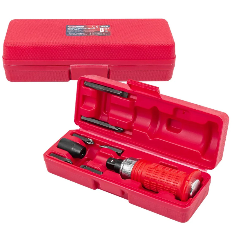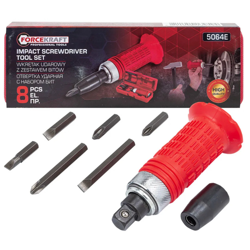 Отвертка ударная с набором бит, адаптером и защитной рукояткой 8пр.1/2 (F)х5/16 (F)(PH2,3х36мм, SL7,8х36мм, PH3х70мм, SL8х70мм),в кейсе FK-5064E