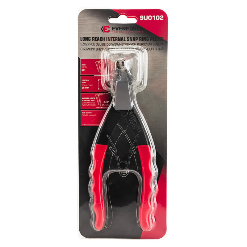 Съемник внутренних стопорных колец изогнутый на 90°. Разработан специально для глубоких отверстий - стопорных колец суппортов, глубина 56 мм. Используются для внутренних стопорных колец диаметром от 3/8 "до 2 " (9,5 - 50 мм). Максимальное раскрытие сьемника 2/3" (17мм). Удобные рукоятки выпуклой конструкции обеспечивают удобный захват и не скользят. Изготовлен из высокоуглеродистой стали - крепкий и надежный съемник.
