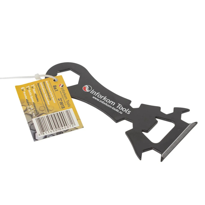 Ключ мультиразмерный с функцией открывашки и мини-линейкой - это многофункциональный инструмент для работы с крепежными элементами и деталями. Он легкий и компактный, что делает его идеальным для использования в труднодоступных местах. Он имеет 6 различных размеров под шестгранную головку (8, 10, 12, 13, 14, 19мм) и функцию открывашки, что делает его универсальным и удобным для использования. Функция открывашки позволяет легко открывать бутылки и другие емкости без использования дополнительных инструментов. Мини-линейка на 40мм на этом ключе делает его еще более универсальным и удобным в использовании.