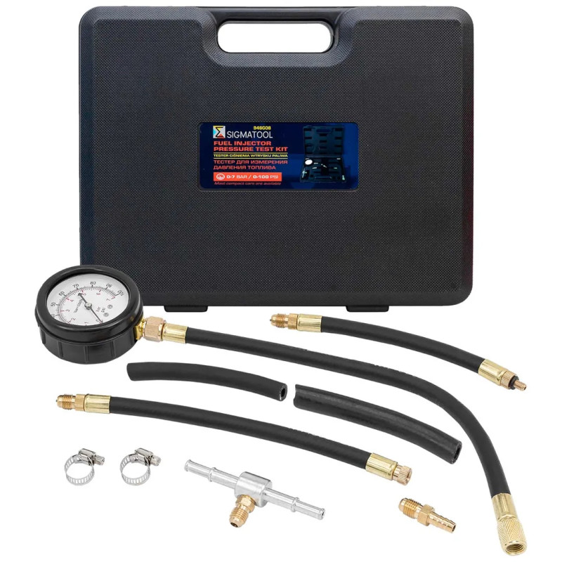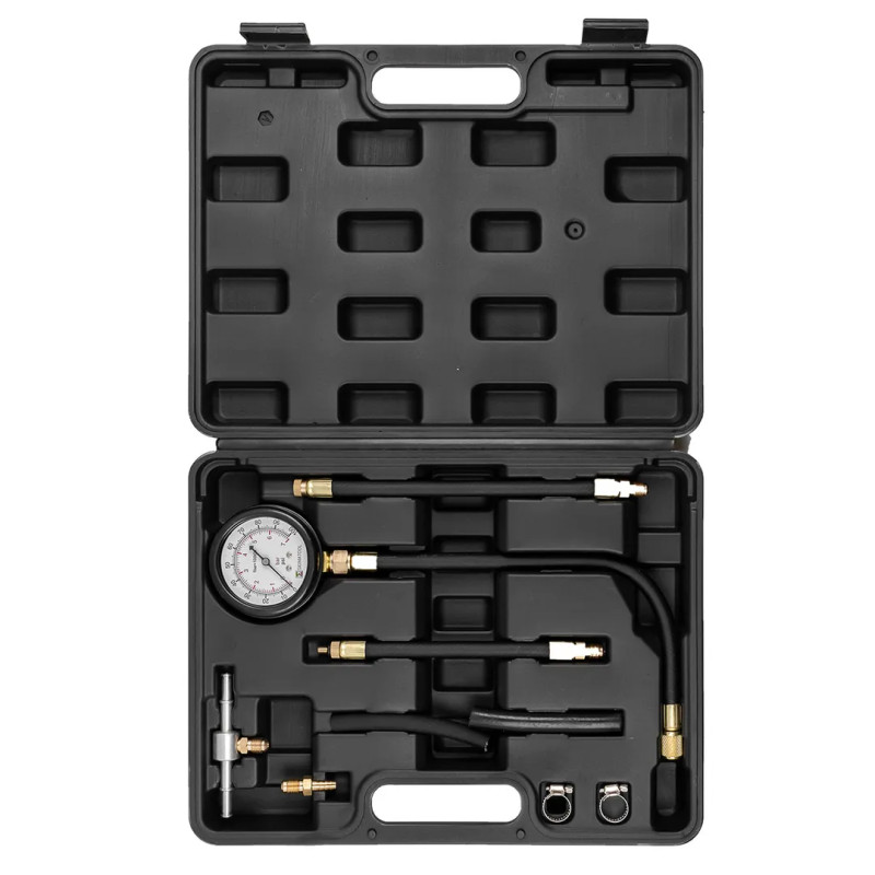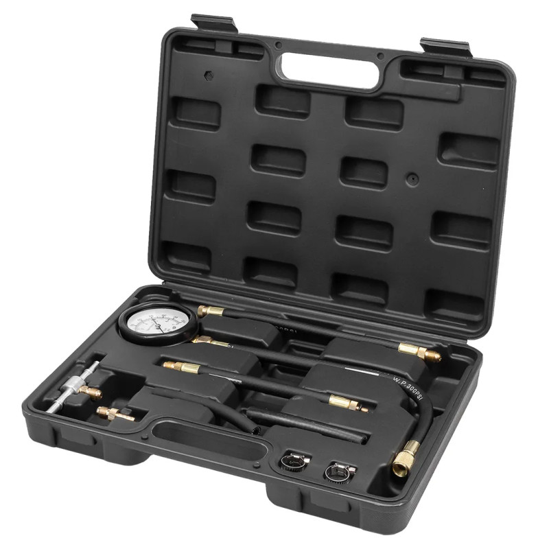 Манометр для измерения давления топлива в комплекте с переходниками 9пр. в кейсе применим для быстрого и точного измерения давления на цилиндре бензинового двигателя. Показания тестера поможет узнать компрессию и если есть отклонения от нормы модификации конкретного двигателя, это может свидетельствовать о неисправностях: поврежденный поршень, изношенные поршневые кольца, трещина в головке блока цилиндров, износ клапанов и др. Комплектация: манометр 0-7бар (0-100psi), шланги с быстросъемными соединениями, переходник, хомуты или стяжки. Манометр имеет большой циферблат с двойной цветной шкалой для легкого чтения показаний с двигателя. Подходит для большинства бензиновых автомобилей. Для удобства хранения и транспортировки поставляется в пластиковом кейсе.