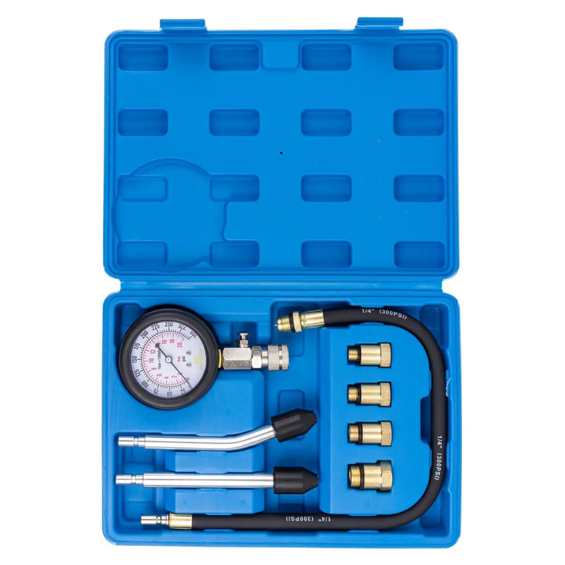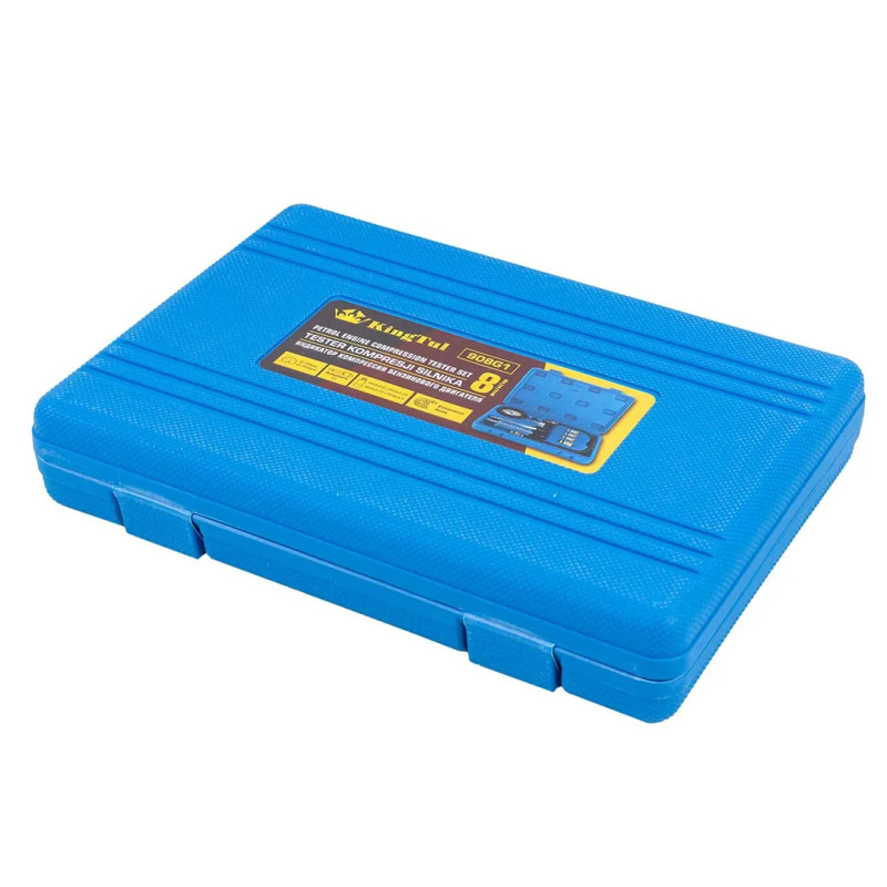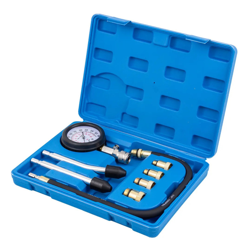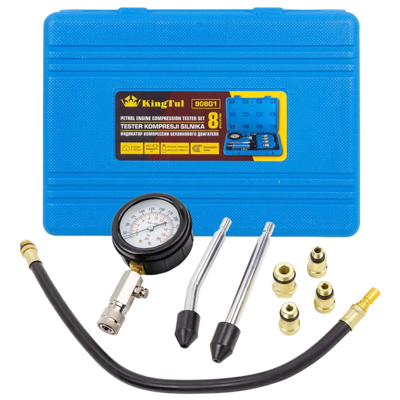 Набор с индикатором компрессии бензинового двигателя из 8 предметов в кейсе. Является профессиональным инструментом для определения давления в цилиндрах бензинового двигателя. Он состоит из манометров с диапазоном измерения 0-20 bar и точностью ±0.25 bar, жёстких прижимных адаптеров и адаптеров с различными резьбовыми соединениями (М10х1.0, М12х1.25, М14х1.25, М18х1.5). Благодаря такому набору, можно быстро и удобно измерить давление в любом бензиновом двигателе. Все инструменты находятся в прочном кейсе, что обеспечивает удобство хранения и транспортировки набора.