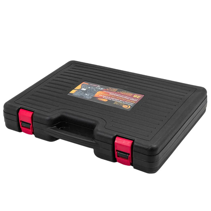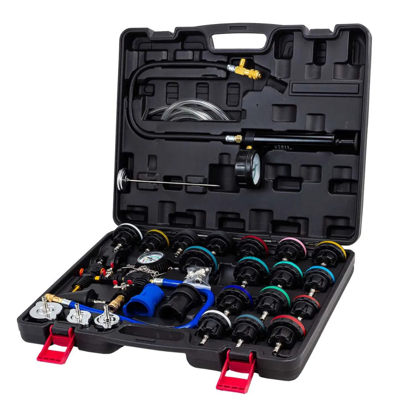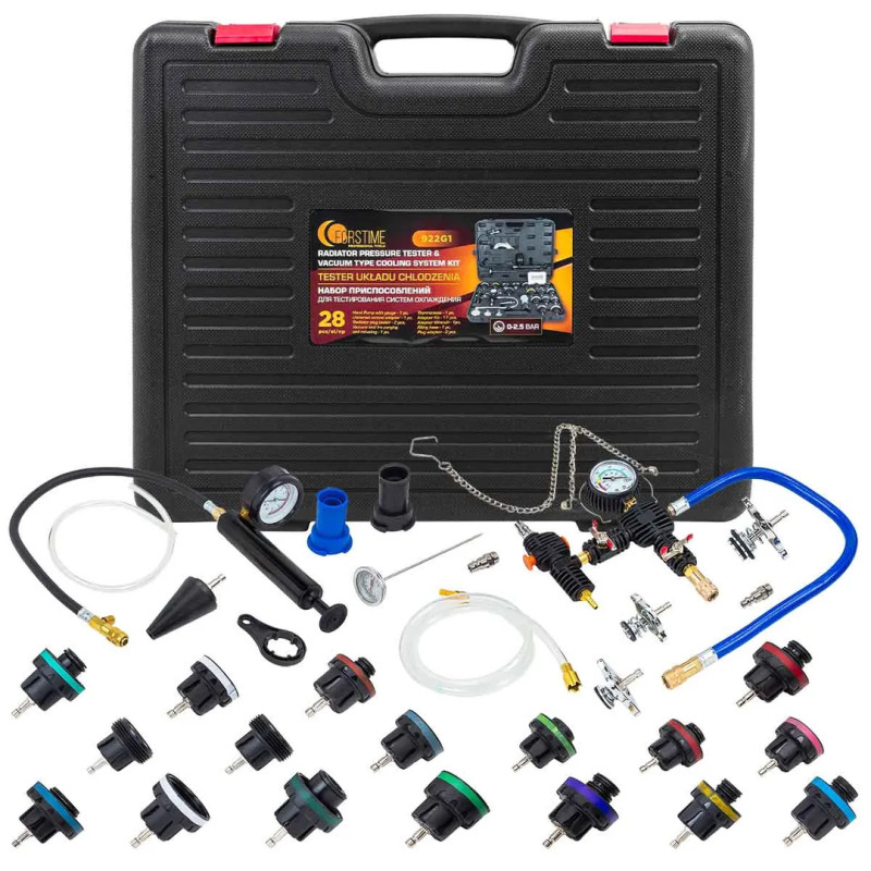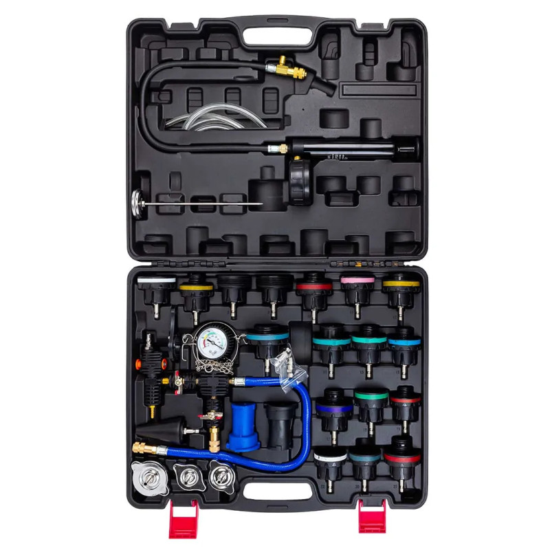 Набор приспособлений для тестирования систем охлаждения 28 предметов (0-2.5bar), в кейсе предназначен для диагностики и определения утечек в системе охлаждения двигателя внутреннего сгорания. В набор входят насос с быстросъёмным разъёмом и адаптеры для заливных горловин радиаторов и расширительных бачков. Комплект подходит для работы с большинством современных автомобилей. Набор подходит для для: GM (Cadillac); Mercedes Benz, GM (Buick), Jeep; Peugeot, Subaru, Chrysler, Acura, GM (Nova, Spectrum, Sprint), Mitsubishi, Nissan, Mazda, Toyota, Infiniti, GEO, Suzuki, Isuzu; Honda, Toyota, Suzuki, Mitsubishi, Chrysler, Acura; Mercedes Benz (ML-class), GM (Achiva, Skylark, Gramd Am 1992…2002гг); Volvo, Saab, Sterling, Citroen, Renault, Fiat, Alfa, Jeep; VW (Vento, T4, Passat-1996, Golf, Beetle, Sharan); Audi (A4, A5, A6), BMW 345, VW (Passat-1997…2002гг); BMW; Audi, VW;Ford, International, Land Rover, Opel, Jaguar; Mercedes Benz (C-class, E-class, S-class). Насос оснащен манометром, нагнетательным шлангом с быстрора